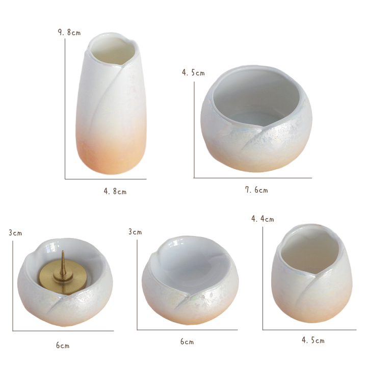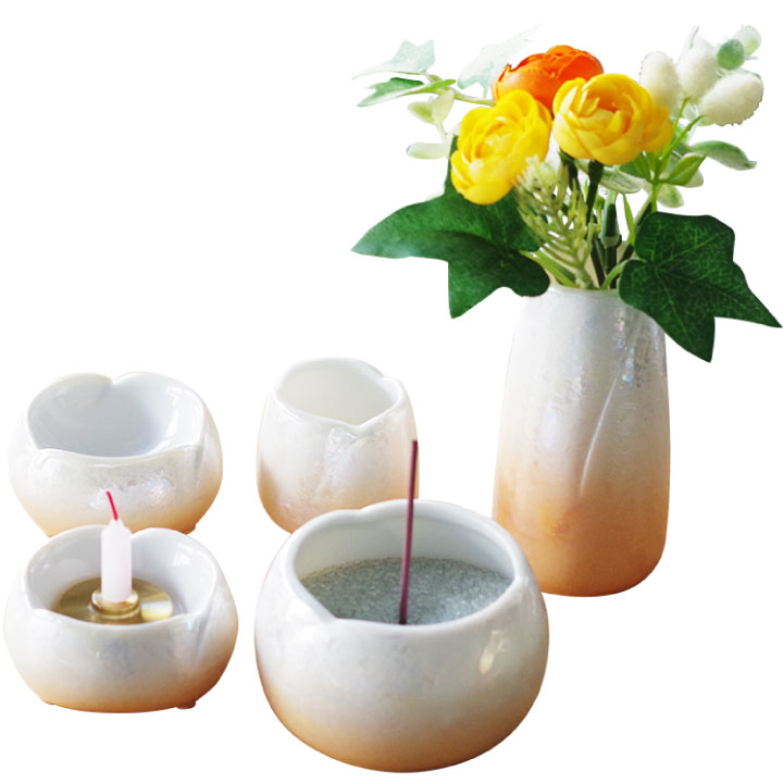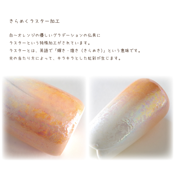 白~オレンジの優しいグラデーションの仏具にラスターという特殊加工が施されています。