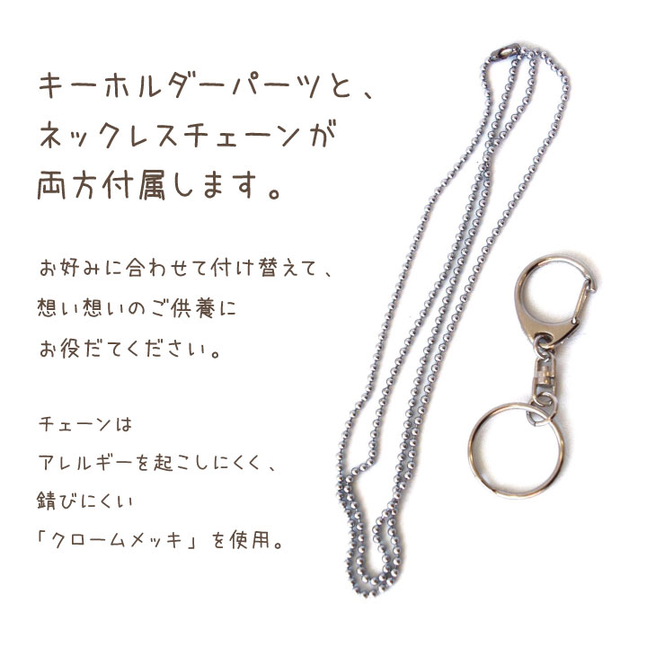 キーホルダーとペンダント用のチェーンを両方合わせてパッケージしていますので、ご希望に合わせてお使いいただけます。